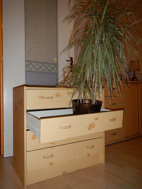 Quatre tiroirs, huit poignées (élaborées à base de pétrole) astucieusement positionnées pour en faciliter l'ouverture. Malgré l'ingéniosité de sa conception et la contenance démesurée de ses tiroirs, on ne pourra pas y camoufler la plante verte offerte par la belle-soeur (photographie numéro 2). On peut tout de même y loger des objets plus communs, tels une enclume en plastique, des disques de Jacques Higelin (mais il ne faut pas en avoir honte) ou encore un déambulateur gonflable. Il est déconseillé d'y ranger des lingots d'or du fait de leur poids conséquent.