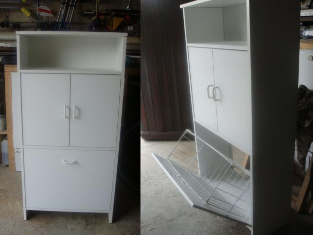 Trois magnifiques meubles en mélaminé blanc. Ils sont en bon état, même si aucun certificat de bonne santé ne sera délivré pour le certifier. Ce mobilier a séjourné dans un environnement chaleureux où il s'est sociabilisé et accoutumé aux bruits de tous les jours. Même vilipendés, ils ne profèreront aucune vilenie et ne rétorqueront même pas. De constitutions modestes (ce ne sont pas des armoires à glaces), ils encaisseront difficilement toute forme de maltraitance, bien qu'à ce jour aucune loi ne l'interdise.