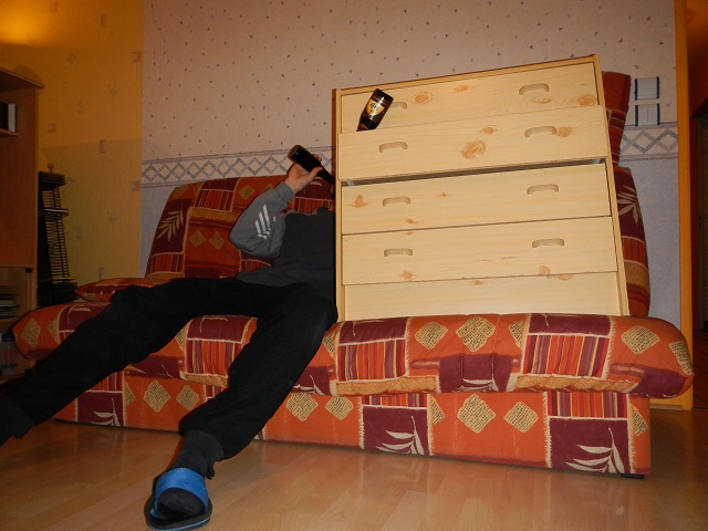 Quatre tiroirs, huit poignées (élaborées à base de pétrole) astucieusement positionnées pour en faciliter l'ouverture. Malgré l'ingéniosité de sa conception et la contenance démesurée de ses tiroirs, on ne pourra pas y camoufler la plante verte offerte par la belle-soeur (photographie numéro 2). On peut tout de même y loger des objets plus communs, tels une enclume en plastique, des disques de Jacques Higelin (mais il ne faut pas en avoir honte) ou encore un déambulateur gonflable. Il est déconseillé d'y ranger des lingots d'or du fait de leur poids conséquent.