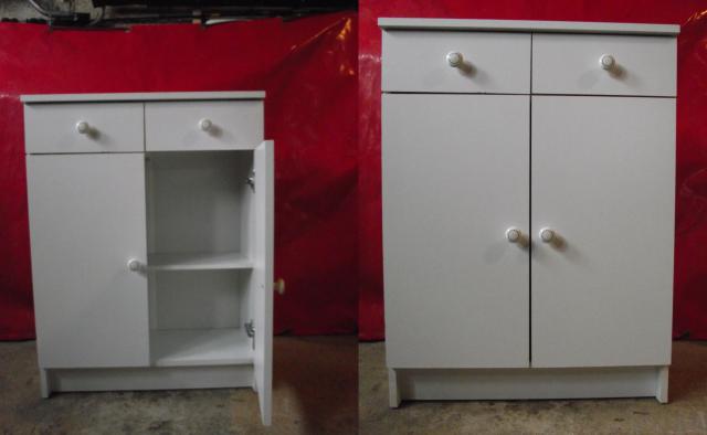 Trois magnifiques meubles en mélaminé blanc. Ils sont en bon état, même si aucun certificat de bonne santé ne sera délivré pour le certifier. Ce mobilier a séjourné dans un environnement chaleureux où il s'est sociabilisé et accoutumé aux bruits de tous les jours. Même vilipendés, ils ne profèreront aucune vilenie et ne rétorqueront même pas. De constitutions modestes (ce ne sont pas des armoires à glaces), ils encaisseront difficilement toute forme de maltraitance, bien qu'à ce jour aucune loi ne l'interdise.