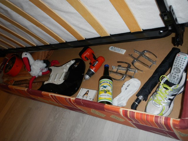 Sous l'assise se trouve un spacieux coffre de rangement dans lequel peuvent se loger couettes, oreillers, couvertures, réveil ou tout autre objet en rapport ou non avec le sommeil. Vous pouvez vérifier par vous-même ces affirmations sur la troisième photographie, où la guitare n'est pas accordée, la bouteille de Pont presque vide, et les sublimes poignées de porte à vendre (une affaire à saisir également).